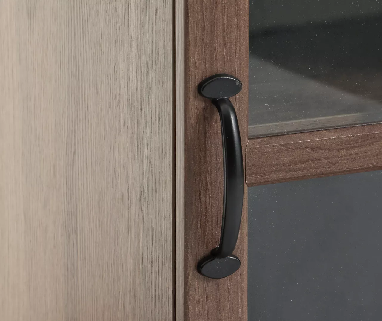 - Designed with glass cabinet doors and adjustable shelving on each side