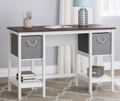Feel like a boss in your home office when you sit down to work at this mid-size computer desk with three storage drawers. The thick-panel floating desktop provides generous room for a laptop and writing materials and allows you to use the tops of the drawer units as storage space. Finished in the same light reclaimed wood-look laminate as the desktop, two small drawers and single larger drawer with a bar for hanging files offer space for items you want to keep off the work surface. For flexibility, the drawer units are reversible and can be installed on either side according to your preference. Supporting the desk are black metal legs in a stylish U shape.