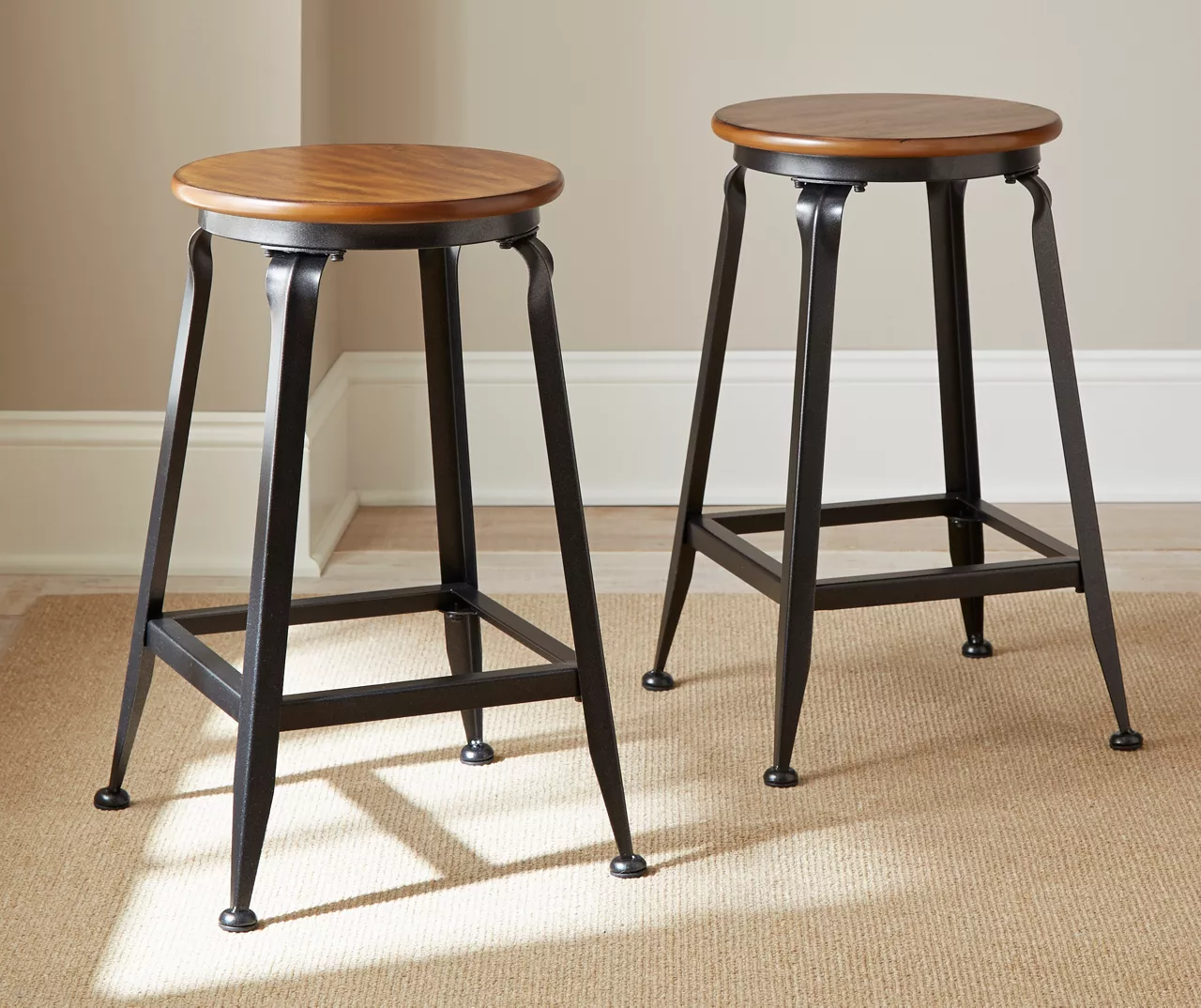 - Round backless seating made with birch veneer and hand-applied burnishing for added dimension
