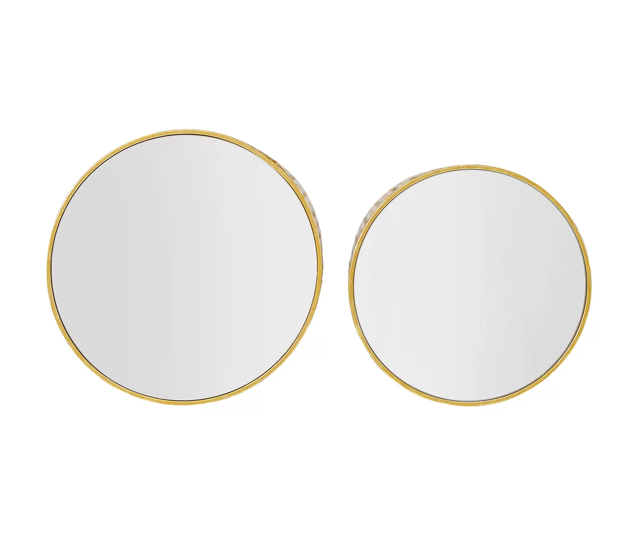 Dazzling and chic, this set of two nesting tables injects a glamorous style and shine into any room. A gleaming gold leaf finish and mirrored top give this set an opulent look while the delicate, round design offers incredible versatility. Feature these tables together for a bold, cohesive look or add them to separate room to inject glitz and style throughout your home.