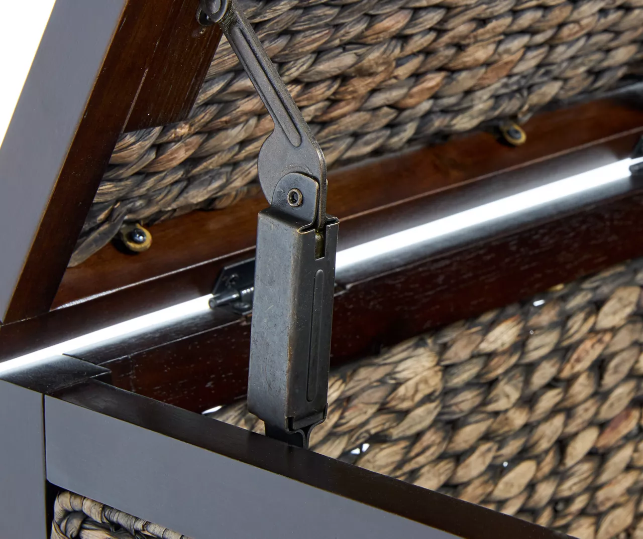 With its black distressed finish and bold frame, this wicker trunk offers both extra storage and farmhouse style in any space. Fill it with linens, blankets and pillows. The black round rings allow you to move it around any space. Interior brackets help the lid remain open while adding or] removing contents. Whether used as an ottoman or coffee table or placed at the base of your bed, it will add all the warm charms of an antique market find.