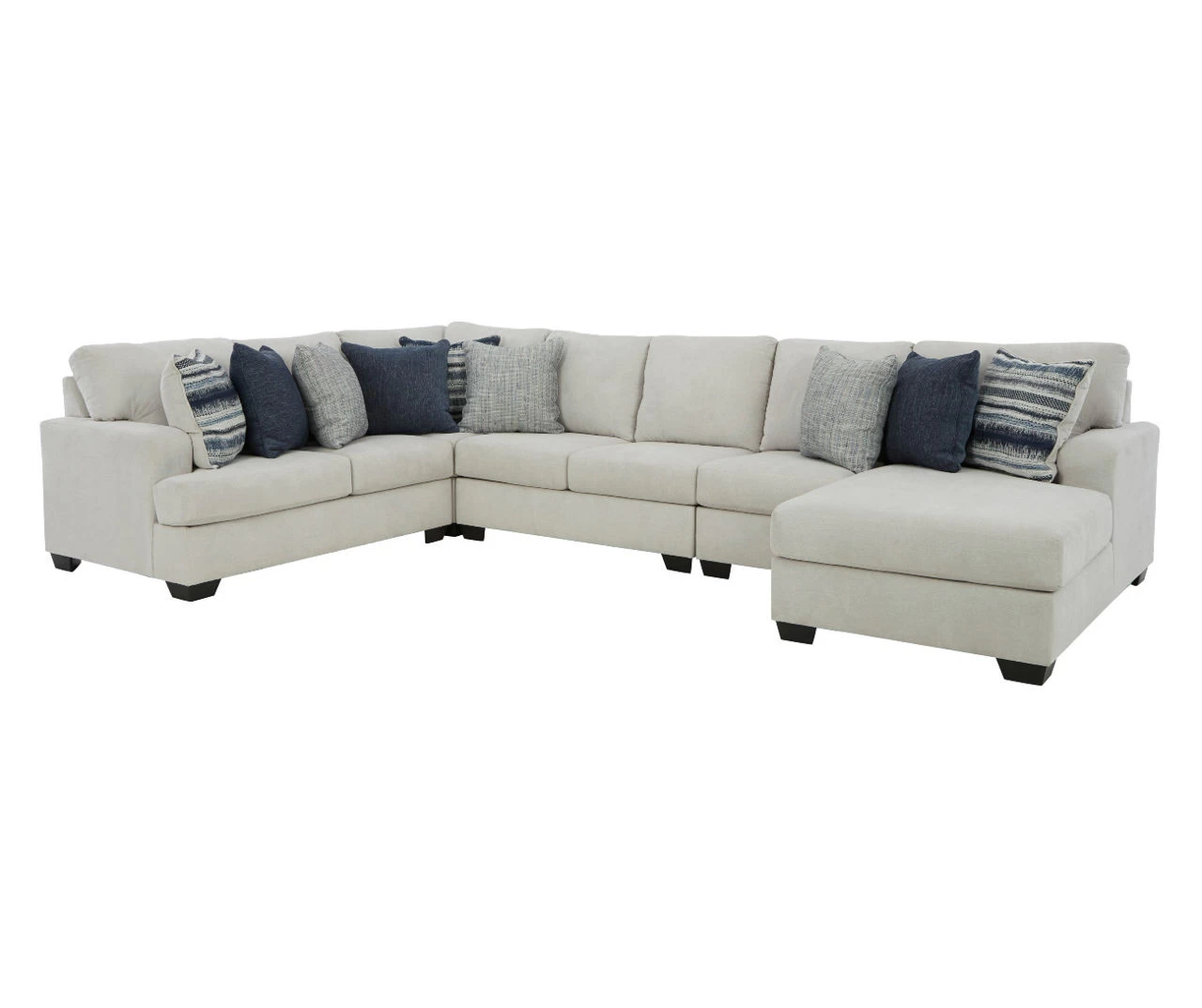 - Stylish 5-piece sectional with right-arm-facing corner chaise, armless loveseat, armless chair, wedge and left-arm-facing loveseat