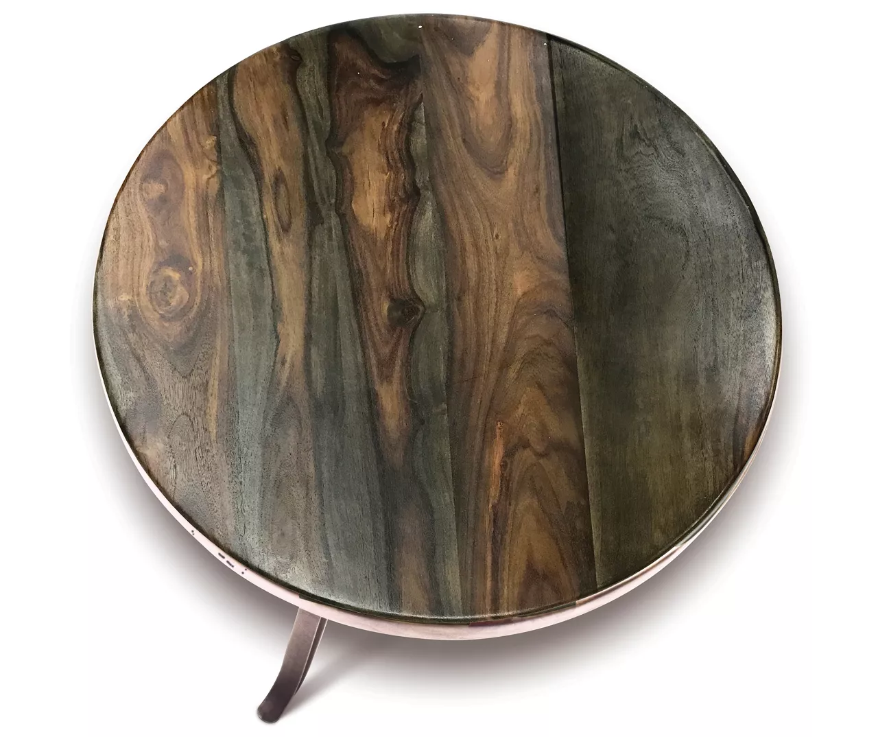 - Sheesham wood top in russet and gray tones- Black powder coated cast iron base